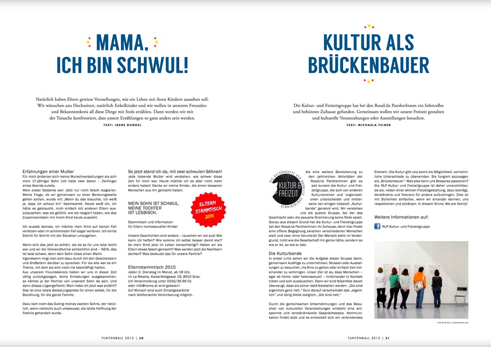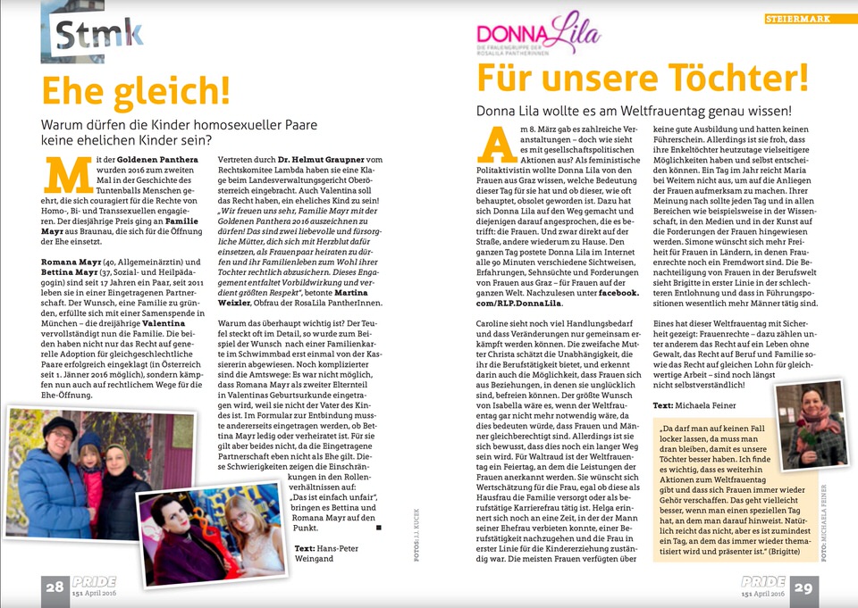Anlässlich des Weltfrauentages zeigt Donna Lila als „Rosenkavalierin der besonderen Art“ ihre Seite als feministische Politaktivistin und präsentiert Sichtweisen, Erfahrungen, Sehnsüchte und Forderungen von Frauen aus Graz. In qualitativen Interviews wurden 12 Frauen zu ihren Meinungen befragt. Alle 90 Minuten wurde ein Statement auf Facebook gepostet. Für unsere Töchter! In: PRIDE (2016) 151, S. 29. Hier geht’s zur Online-Ausgabe.Frauen