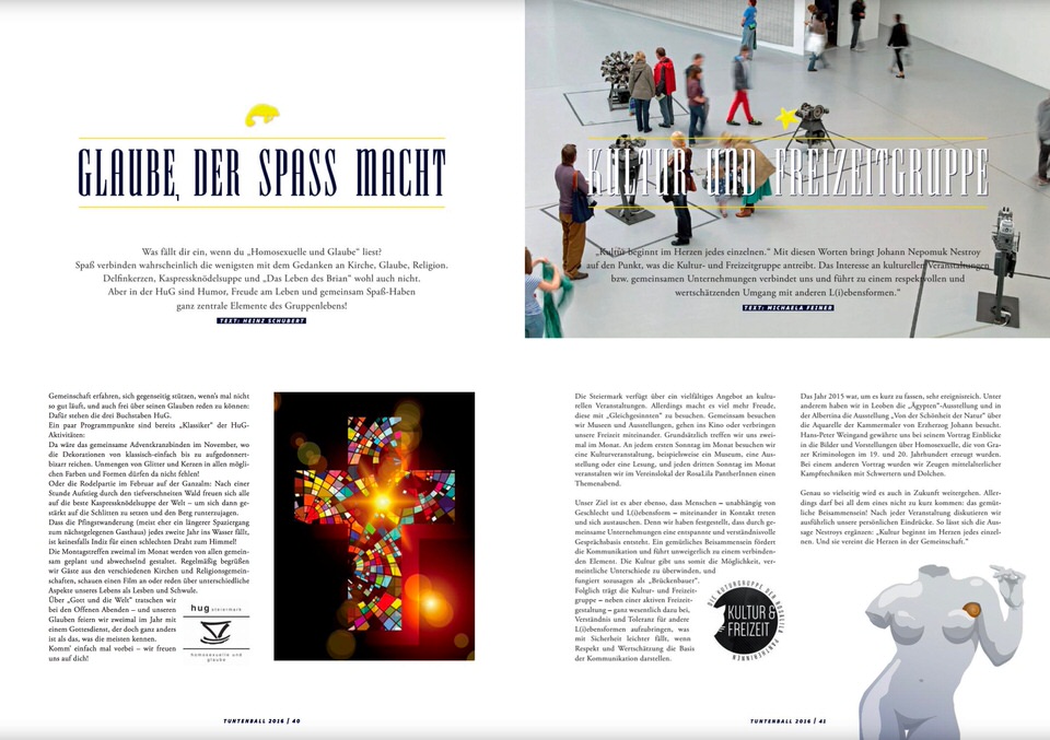 Ziel der Kultur- und Freizeitgruppe ist ein respektvoller Umgang mit anderen Menschen und gemeinsame Unternehmungen wie beispielsweise der Besuch von Ausstellungen und Museen oder sonstige Freizeitaktivitäten. Kultur- und Freizeitgruppe. In: Panthera (2016), S. 42. Hier geht’s zur Online-Ausgabe.Kultur
