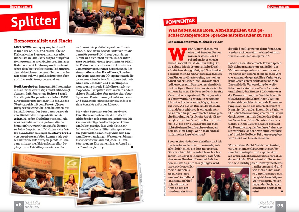 In einem Kommentar wird der Frage auf den Grund gegangen, was es mit der obligatorischen Rose zum Internationalen Weltfrauentag, unzähligen Angeboten von Abnehmpillen und der Präsenz von Frauen in der Sprache auf sich hat. Weiters werden einige einfache und dennoch sehr aussagekräftige Variante aufgezeigt, Frauen sprachlich sichtbar zu machen. Was haben eine Rose, Abnehmpillen und geschlechtergerechte Sprache miteinander zu tun? In: PRIDE (2017) 157, S. 9. Hier geht’s zur Online-Ausgabe.Frauen