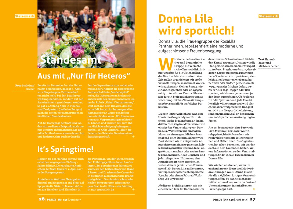 Die Frauengruppe Donna Lila hat sich ein ehrgeiziges Ziel gesetzt: Gemeinsam wollen alle Mitglieder mehr für ihre Gesundheit tun, indem sie sich mit Freude körperlich betätigen, neue Sportarten ausprobieren und einfach gemeinsam die frische Luft im Park genießen. mit Hannah Bayer: Donna Lila wird sportlich! In: PRIDE (2017) 158, S. 27. Hier geht’s zur Online-Ausgabe.Frauen