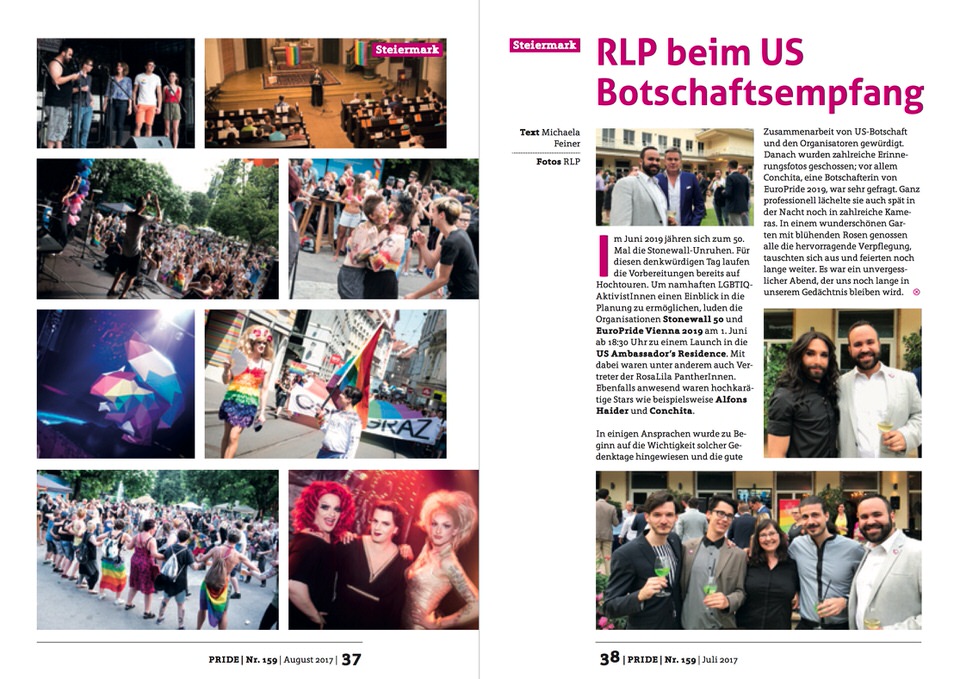 2019 jähren sich die Stonewall Unruhen bereits zum 50. Mal. Anlässlich dieses Jubiläums veranstalteten die Organisationen EuroPride Vienna 2019 und Stonewall 50 einen Launch im Anwesen des US-Botschafters. Ziel war es, hochkarätigen Persönlichkeiten der LGBTIQ Community über den Fortschritt der Planungen zu informieren. 2017 07 – RLP beim US Botschaftsempfang. In: PRIDE (2017) 159, S. 38.Geschichte