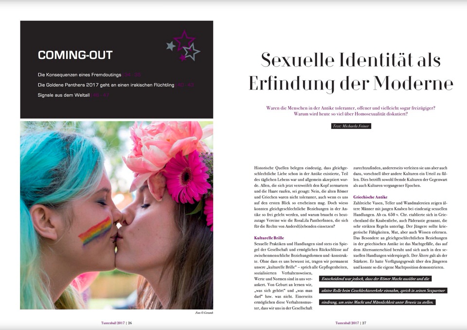In diesem Artikel werden der unterschiedliche Umgang mit gleichgeschlechtlicher Liebe und die Verankerung im Alltagsleben beleuchtet. Wie wurde dies bei den alten Römern und Griechen gehandhabt? Wann ist der Begriff Homosexualität aufgekommen? Dies und Vieles mehr erfahren Sie in diesem Beitrag! Sexuelle Identität als Erfindung der Moderne. In: Panthera (2017), S. 27-29. Hier geht’s zur Online-Ausgabe.Geschichte