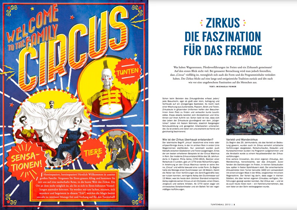 Dieser Artikel beschäftigt sich mit den Anfängen der Zirkusgeschichte, setzt sich mit seinen Vorläufern wie Varieté oder Wanderzirkus auseinander und stellt sich die Frage, was Wagenrennen, Pferdevorführungen im Freien und ein Zirkuszelt gemeinsam haben? Zirkus – Die Faszination für das Fremde. In: Panthera (2015), S. 3. Hier geht’s zur Online-Ausgabe.Zirkus